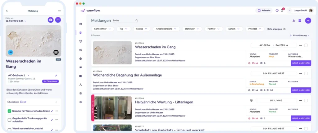 Der zweite große Vorteil sind die automatisierten Erinnerungen. Anstatt Excel-Tabellen manuell zu pflegen, überwacht Wowflow jetzt alle wiederkehrenden Aufgaben. Das System sendet proaktive Benachrichtigungen, wenn eine Inspektion ansteht oder überfällig ist.